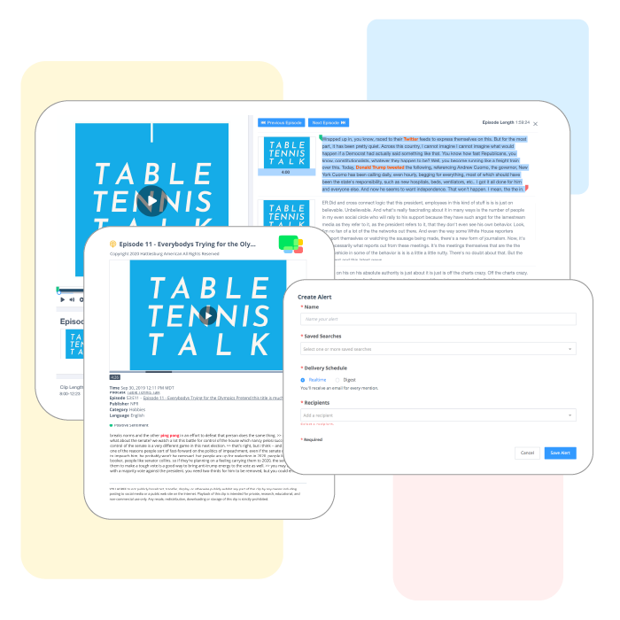 Track your mentions across thousands of the world's top podcasts. Get real-time alerts for mentions, access text transcription and edit clips.