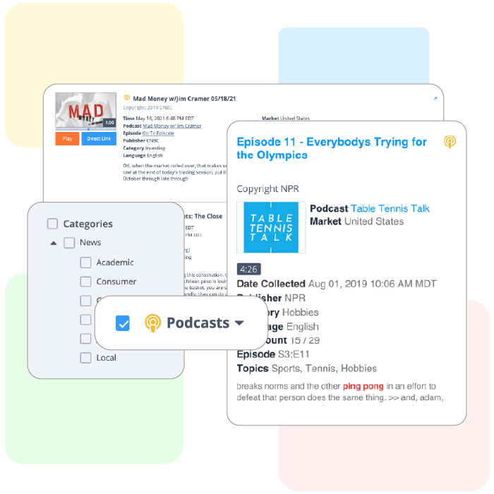 Monitor podcasts across a wide variety of verticals including news, politics, business, entertainment, healthcare and more